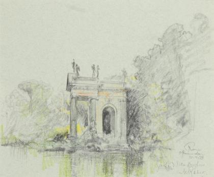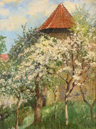 TETZNER, Bertha (1864 Osterrode - 1941). Obstbäume vor Wehrturm.
