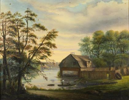 Gehöft am Ufer mit mehreren Staffagefiguren in Booten und an Land mit Blick über das Wasser unter wolkigem Himmel