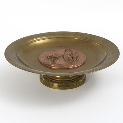 Tazza mit verziertem Bronzefuß; im Zentrum der Schale montiertes Bronzerelief mit Verkupferung: Am brennenden Dreifuß-Altar libierend opfernde Frau im Stil der Antike