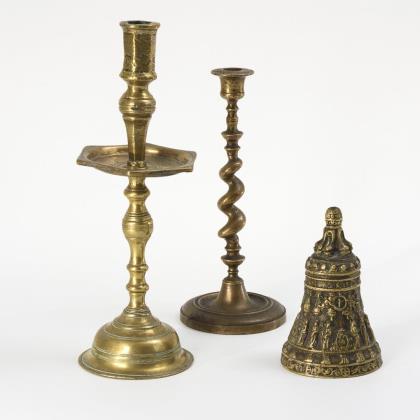 Großer massiver Leuchter mit glockenförmigem Fuß, Balusterschaft und 6-eckigem, mit Punzen verziertem Kragen sowie 6-eckiger Tülle. / Leuchter mit spiralig tordiertem Schaft. / Verkleinerte Nachbildung der 1785 von Luigi Valadier gegossenen großen Glocke des St.-Peter-Doms in Rom mit den Aposteln auf der Flanke