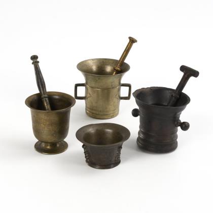1x mit 2 Knopfknäufen und Wulst-Kehle-Profilierungen, auf dem Boden eingestanzte Zahl "1762". Dazu 1 Krückenpistill. / Mörser mit 2 Winkelgriffen und ausladender schmaler Lippe; verziertes Pistill. / Becherförmiger Mörser mit 2 wohl mitgegossenen Palmettenfriesen, die von Linien flankiert werden. Dazu Pistill mit Wirtel und Knauf. / Wohl spanischer Mörser mit 3 Rippen