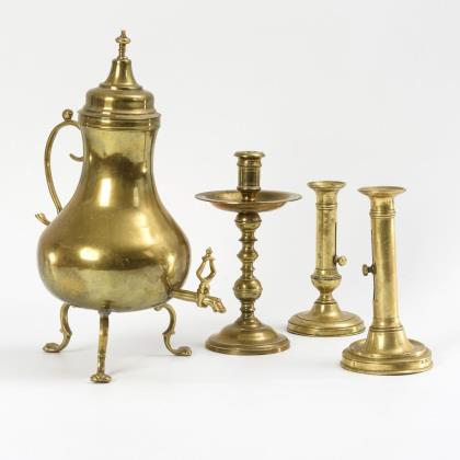 Auf 3 Beinen stehende "Dröppelminna" in Balusterform mit Volutenhenkel, Lyraküken am Ausguss und hohem Passdeckel. / Kragenleuchter im Barock-Stil mit Kugeln und Wirteln am 2-teiligen Schaft und Walzentülle über der Tropfschale. / 2 verschiedene Biedermeier-Schiebeleuchter