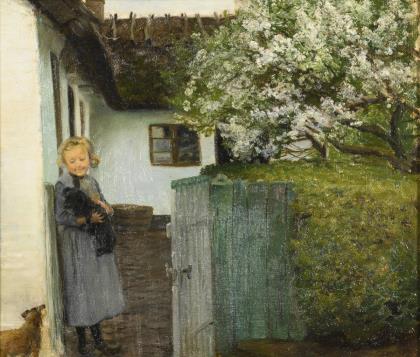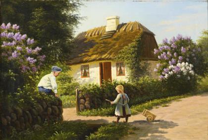 LARSEN, Alfred (1860 Stenderup - 1946 Virum). Monogrammist "AL": Geschwisterpaar vor Bauernhaus.