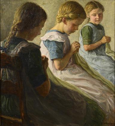 Drei Mädchen bei konzentrierter Arbeit in der Stube