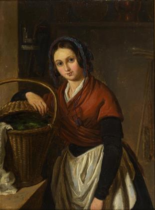 Bildnis einer jungen Frau in der Küche mit einem Korb voll Gemüse