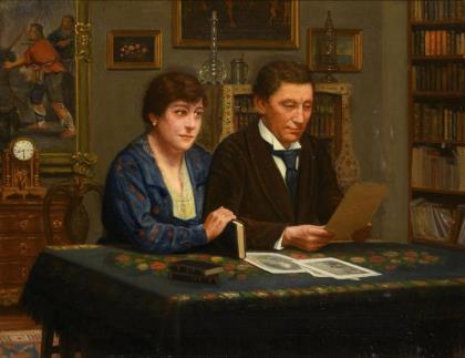 Ehepaar am Tisch in der bürgerlichen Stube beim Betrachten verschiedener Druckgrafiken