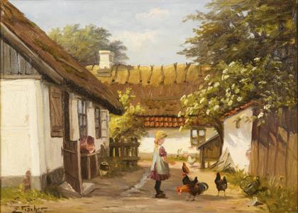 FISCHER, Edmund (vor 1910 - 1944). Kleines Mädchen füttert Hühner.