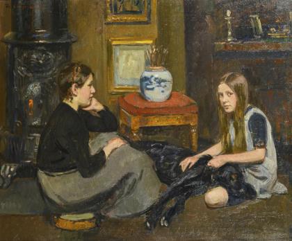 Die zwei Kinder mit dem schwarzen Hund neben einem Ofen und einem Hocker mit Pinseln in einer Vase