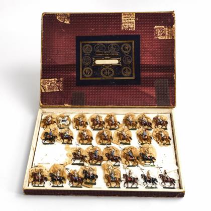 Bauchig-gedrückte Form mit Blütenreliefs und Kugelfüßen. Unterseitig 8 Namensgravuren für einen Inspektions-Offizier. Mit Schloss, ohne Schlüssel