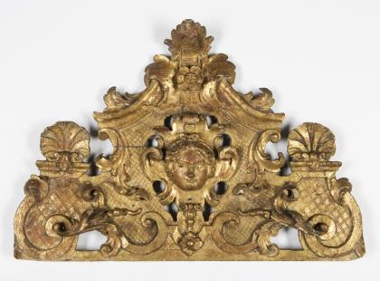 Reliefiert, durchbrochen gearbeitet, Reste goldener Fassung. Aufwendig gearbeitete geschweifte Form mit Voluten-, Muschel-, Blüten- und Blattdekor