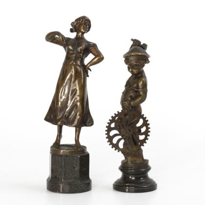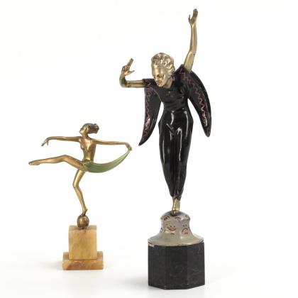 Seltene, polychrom bemalte Bronze-Tänzerin mit leicht diabolischer Anmutung auf schwarzem Marmor-Sockel. Signiert, Prof. Otto Poertzel (1876 Scheibe/Thüringen - 1963 Coburg, studierte an der Akademie in München). / Kleine, mit Goldbronze und Grün gespritzte Metallguss-Ausdruckstänzerin auf ockerfarbenem Marmor-Sockel