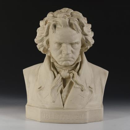 Fritz Kochendörfer mit Nr. signierte junge Frau mit Kopftuch. / Lesendes Kind aus Pyrochrom mit Resten einer Bemalung; unterseitig Marke "Gladenbeck Berlin & Friedrichshagen". / "Frederic" signierte Kinderbüste mit Bronzekleid; unterseitig Marke Carl Schumacher Osterode. / Undeutlich (Hilvö?) signierte Kinderbüste; unter der Plinthe Marke von Reps & Trinte Magdeburg. / Mädchenbüste mit schwarz bemalter Plinthe; unterseitig Marke KB an Wappen wohl für Kochendörfer & Braun