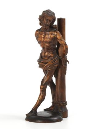 Anatomisch genau und detailliert ausgearbeiteter Oberkörper des Heilands sowie etwas überlängte Proportionen. Jesus steht an der Säule gefesselt und wendet sich schmerzvoll zur Seite, wobei er ein Bein weit vorstellt. Aus einem Stück geschnitzt