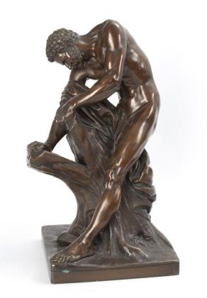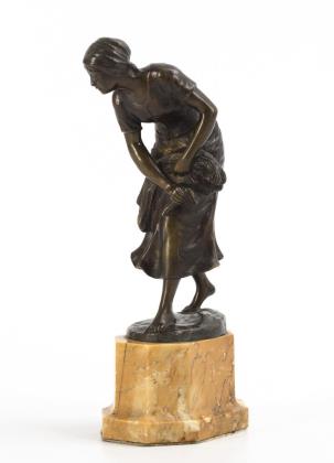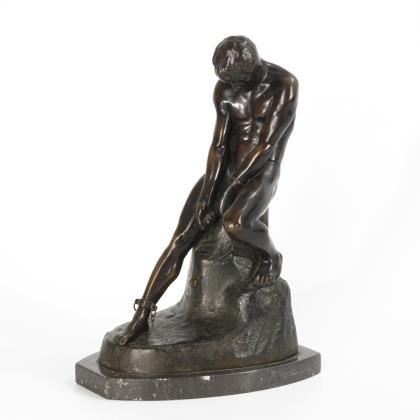 Zurückgelehnt sitzende junge Frau (wohl Nymphe oder Venus) beim Binden der Sandale. Qualitätvoller Guss aus 2 Teilen frei nach Ernst Seger