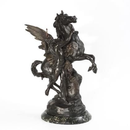Der Held Perseus mit Flügelhut und dem Haupt der getöteten Gorga Medusa hält gleich einem Rossebändiger das geflügelte Pferd fest, das kraftvoll gen Himmel strebt