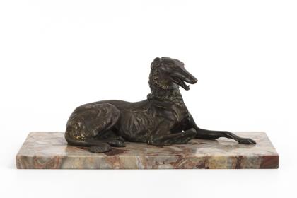 Auf der Plinthe liegender eleganter Hund (Barsoi?) mit aufmerksamer Kopfhaltung