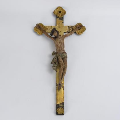 Schlanker Corpus Christi mit gelängten Proportionen und voluminös gefaltetem Hüfttuch mit Cingulum. Christus mortuus am wohl originalen Kreuz mit muschelförmiger Applik unten sowie Vierpassrosetten an den Kreuzenden