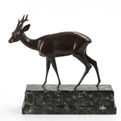 Leicht stilisiert mit spannungsvoller glatter Oberfläche gestaltetes Tier, dessen Gehörn aufgeschraubt ist
