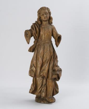 Stehender Engel mit ausgebreiteten Armen und bewegter, voluminöser Fältelung am langen Gewand. Rückseitig ist die Steckmontierung der Flügel erkennbar