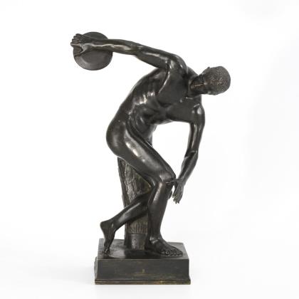 Fein ausgeführter Diskuswerfer auf rechteckiger Bronze-Plinthe sowie mit der Stütze einer römischen Marmorkopie