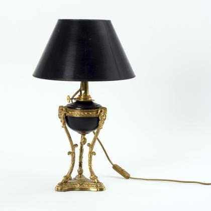 Nachträglich elektrifizierte Petroleumlampe mit 3-seitiger Plinthe, 3 schlanken Füßen als Geiß-Monopodien am halbkugeligen schwarzen Tank. Am Brenner montierte Schraubfassung im trapezförmigen Schirm (außen schwarz, innen goldfarben)