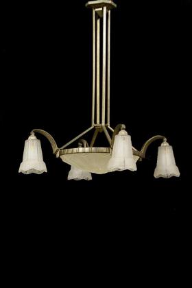 5-flammige Hängelampe mit Gestell aus 4 Mittelstreben, Metallring mit 4 geschweiften Armen, darin zur Decke geöffneter Glaseinsatz, Arme mit abhängenden Tulpenglasschirmen