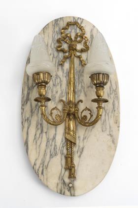 Ovale Marmor-Wandplatte mit montierten Bronzetuch und -schleife als Halter für die beiden blattbesetzten Arme mit den knospenförmigen Glasschirmen über den Schraubfassungen. Druckschalter im unteren Bereich