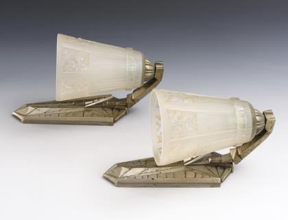 Abstrakt geometrisch reliefierte Wandhalterungen mit kurzem Arm; ähnlich reliefierter Glasschirm; Schraubfassung