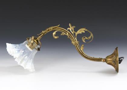 Barock floral reliefierte Wandhalterung, gebogener Vierkantarm mit Wirtel und Blattkranz am glockenförmigen Glasschirm; Bajonettfassung