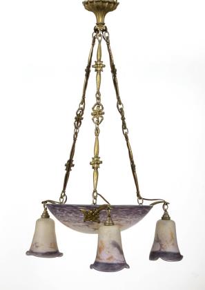 4-flammige Hängelampe mit Glasschale und 3 tulpenförmigen Lampenschirmen an floralverziertem Gestell mit 3 geschweiften Armen und Rosettenbaldachin an Kettenaufhängung; Glas mit weißen und violetten Pulvereinschmelzungen
