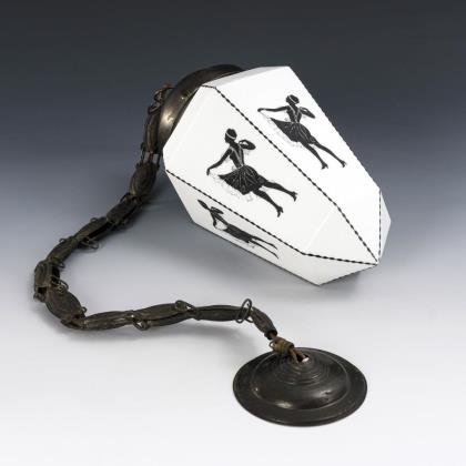 Am Baldachin und geprägten Kettengliedern hängende Lampe mit spitz zulaufendem, 6-eckigem Glasschirm; auf allen Seiten die gleiche Tänzerin