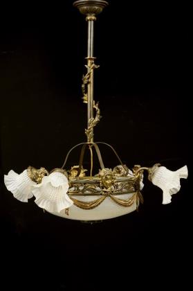 5-flammige Hängelampe an Mittelstrebe und Metallring mit geschweiften Armen; reich dekoriert mit antikisierenden Köpfen, Girlanden und Rankenwerk; eingesetzte, nach oben geöffnete Glasschale mit Schuppendekor und 4 zur Seite geöffnete Tulpenschirme