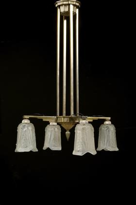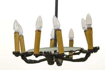 8-flammige Deckenlampe an geschwärzter Mittelstrebe mit Tulpenbaldachin (daran weitere Metallstrebe) und 4 Armen in Form einer vollplastischen weiblichen Menschengestalt, die in den Händen je 1 Kerzentülle halten, akzentuiert mit satinierter Glasplatte