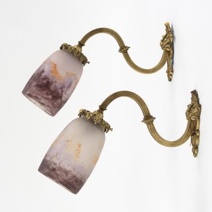 Runde Wandhalterung mit Akanthus-Relief, gebogener Schaft mit Blattbesatz, Schraubfassung im Glasschirm mit gekniffenem Rand