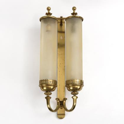 2-flammige Röhren-Wandlampe an Messinghalterung mit volutierten Armen, satinierte Glasröhren