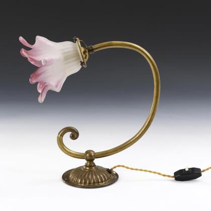Fuß in Form einer herzförmig gebundenen Girlande mit Schleifen und Pfeilköchern, fester Bogenschaft, mit Kugelgelenk drehbar gelagerte Bajonett-Fassung mit Drehschalter, glockenförmiger Glasschirm