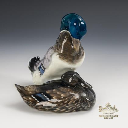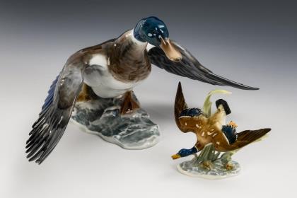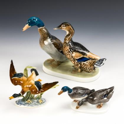 2x ROSENTHAL: Entenpaar, Modell-Nr. K 341, Entwurf 1913 von Willy Zügel (1876-1950) (H 16,5 cm); Entenpaar, Modell-Nr. K 153, Entwurf 1912 von Karl Himmelstoß (1872-1967) (H 6,5 cm). / 1x HUTSCHENREUTHER: fliegender Erpel, Modell-Nr. 2163, Entwurf 1950 von Hans Achtziger (1918-2003) H 10 cm)
