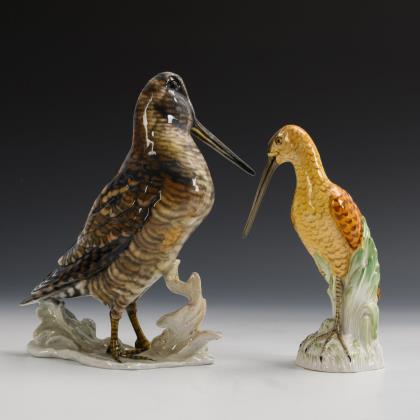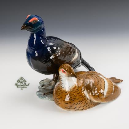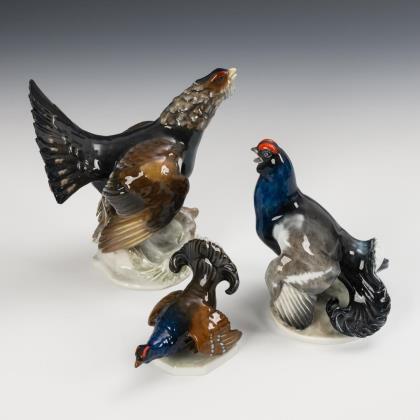 1 Auerhahn: 1x Modell-Nr. 1695, Entwurf 1938 von Fritz Heidenreich (1895-1966), bezeichnet (H 16 cm). / 2 Birkhähne: 1x Modell-Nr. 1987, Entwurf 1955 von Fritz Heidenreich, bezeichnet (H 14,5 cm); 1x Modell-Nr. K 290, Entwurf 1913 von Fritz Diller (1875-1945), monogrammiert (H 9 cm)