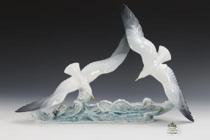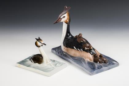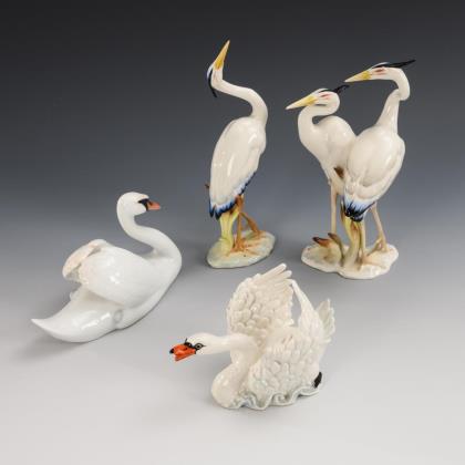 2x HUTSCHENREUTHER, Modell-Nr. 2338 und 2417, Entwurf 1955 von Hans Achtziger (1918-2003), bezeichnet: Reiher und Reiherpaar an Schilf (H 20,5 und 22 cm). / 1x NYMPHENBURG, Modell-Nr. 976, Entwurf 1956 von Louise Terletzki-Scherf (1902-1966), bezeichnet: fauchender Schwan (H 10 cm). / 1x ROYAL COPENHAGEN, Modell-Nr. 755, Entwurf 1906 von Erik Nielsen: Schwan (H 10,5 cm)