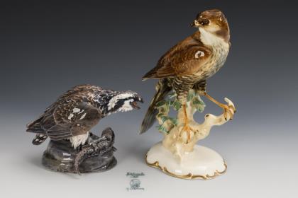 1x HUTSCHENREUTHER, Modell-Nr. 1486, Entwurf 1936 von Hans Achtziger (1918-2003): auf einem Baum sitzender Sperber (H 30 cm), bezeichnet "Tutter" (H 30 cm). / 1x DAHL-JENSEN, Modell-Nr. 1290, Entwurf um 1910/20 von Jens Peter Dahl-Jensen (1874-1960), monogrammiert: auf einem Felssockel sitzender Fischadler mit Forelle (H 14,5 cm)