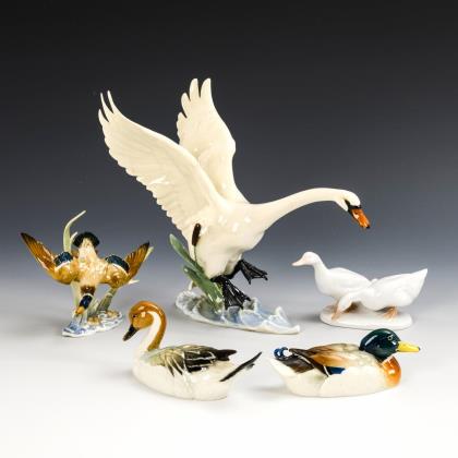 4x HUTSCHENREUTHER: auffliegender Schwan (Mod.-Nr. 2303, Entwurf H. Achtziger, 1954; H 22,5 cm), fliegender Erpel (Mod.-Nr. 2163, Entwurf H. Achtziger, 1950; H 12,5 cm), Ente (Mod.-Nr. 8831, Entwurf U. Netzsch, 1985; L 14 cm) und Ente (L 15 cm). / 1x ROSENTHAL: Entenpaar (Mod.-Nr. K 153, Entwurf K. Himmelstoss, 1912; H 7,5 cm)
