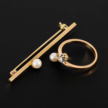 Brisur mit kleinen Zuchtperlen und Diamant. Abgehängte Zuchtperle in Tropfenform. Runde Brisur mit gefasster Zuchtperle. Klipp/Steckmechanik. Steckmechanik