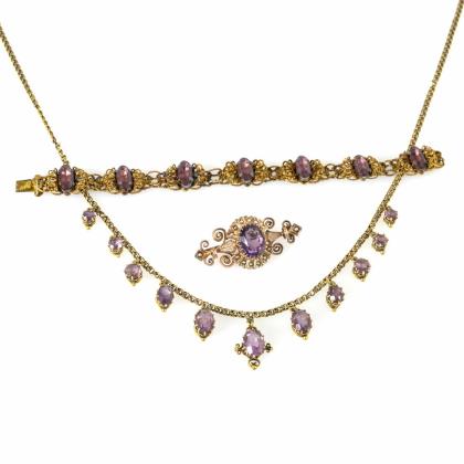 Halskette, Brosche und Armband mit amethystfarbenen Imitationen.