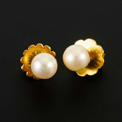 Zuchtperle, umringt von je 6 kleinen, chatongefassten Saphiren. Klippmechanik