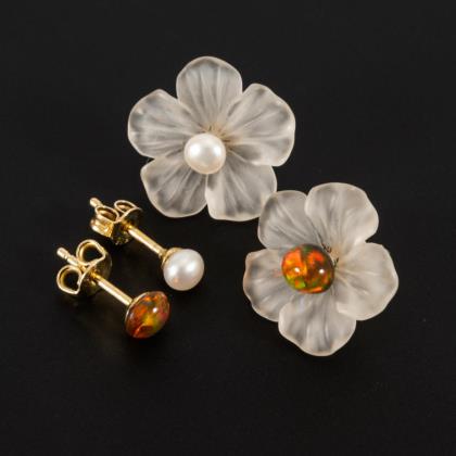 Kleine Opalcabochons und Perlchen, mit Steckmechanik. Dazu 2 aufsteckbare, geschnittene Bergkristallblüten