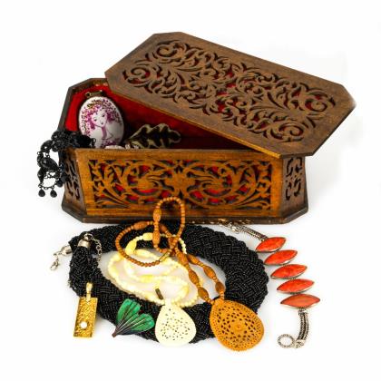 Geflochtene Kragenkette und Collier aus Glaskugeln und -einlagen. Ankerketten, Karabinerschließen. / enBein- und Holzkette mit durchbrochen Anhängern. Schraubverschlüsse / Silbernes Armband mit zargengefassten Schaumkorallen-Cabochons mit Knebelschließe. 2 silbervergoldete Anhänger mit Zuchtperle und bemalter, zargengefasster Porzellantafel. 3 emaillierte Broschen. 2 Modeschmuckbroschen mit Strass und Kunstperlen (2 Kunstperlen fehlen). Metall, Hakenverschlüsse. In Laubsäge-Holzkiste mit Deckel, rot ausgekleidet