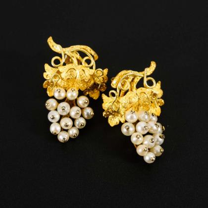 Plastisch gearbeitete Weinlaub-Brisur mit perlenbesetzter Traubenanhängung. Steckmechanik