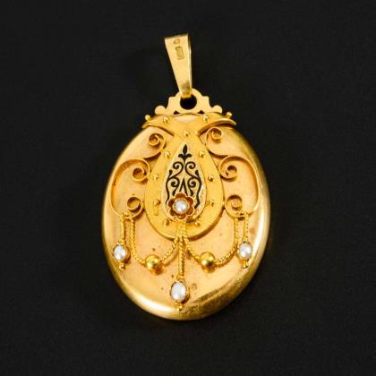 Anhänger mit filigraner Ornamentmontierung, partiellem Schwarzemail und 4 gefassten Perlchen. Rückseitig gerahmt verglastes Fach mit zeittypischer Fotoeinlage