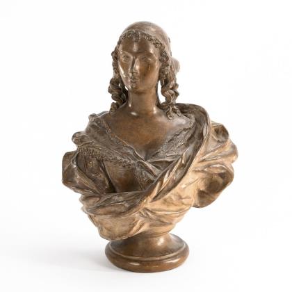 Historisierende und stilisierende Büste einer jungen Frau mit Kartenblatt und eines jungen Mannes mit Federhut und Geigenhals
