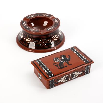 Runder Ascher mit hohem Fuß (Modell-Nr. 221a, Ø 18,5 cm), flache Rechteckdose mit Sphinx (Modell-Nr. 112, Ø 12,5 cm)